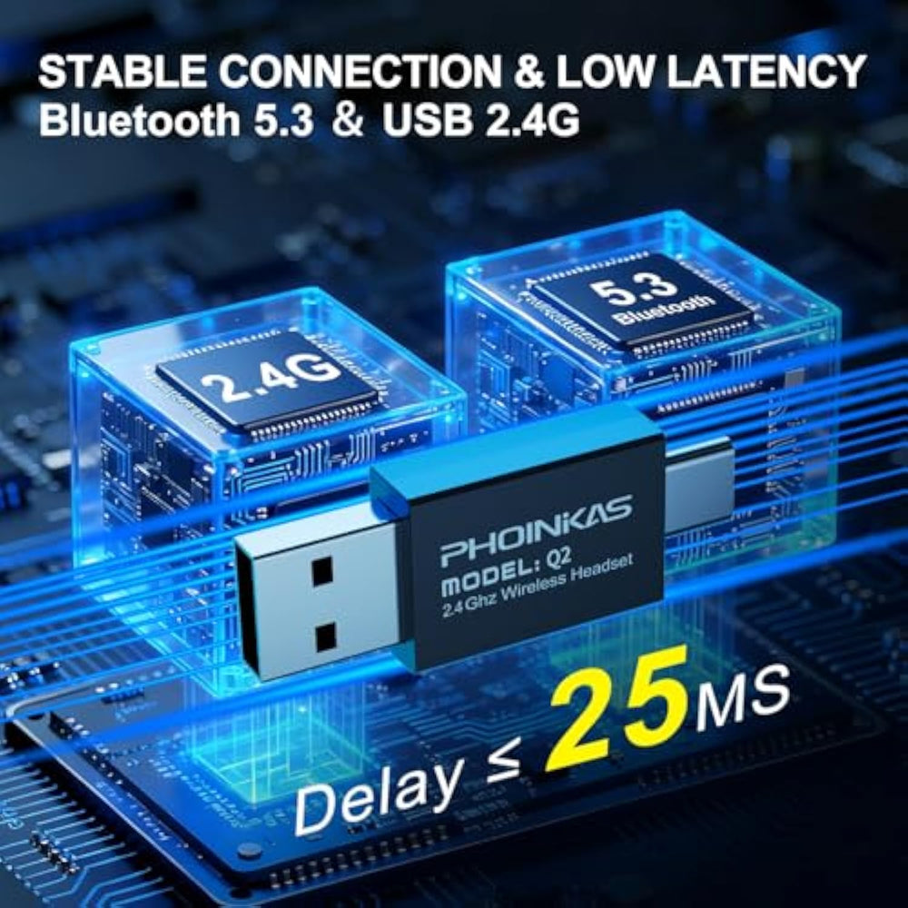 | ?Wireless 2.4Gusbbluetooth5.3Wired Connection Headset?2.4Ghz Mode: Adopting Ultra-Low Latency Lossless Wireless Technology To Realize High-Fidelity Audio, Audio Latency Is Less Than 25 Milliseconds.Bluetooth 5.3 Mode:Enjoy Audio With Freedom Of Movement During Smartphone Gaming, Video Watching, Work,Commuting Or Fitness.2.4Ghz Wireless:Ps5,Ps4,Pc,Mac, Switch.Bluetooth5.3 : Smartphones, Tablet, Bluetooth-Enabled Devices.3.5Mm Wired Connection: Ps4/Ps5, Pc, Switch And Other Gaming Devices | | ?Omnidirectional Noise-Canceling Mic?This Gaming Headset Features A High-Sensitivity Noise-Suppression Microphone That Captures Audio From 360 Degrees. Mic Ensuring Effortless Voice Pickup And Crystal-Clear Online Communication Quality For Seamless Voice Chat.When Not Needed, The Foldable Retractable Mic Discreetly Tucks Away, Instantly Transforming The Headset Into Standard Headphones For Music Enjoyment. On-Cable Controls Enable Instant Volume Adjustment And One-Touch Mic Muting. | | ?Gaming Headset With 7.1 Surround Sound?Featuring 50Mm High-Precision Neodymium Drivers And Advanced 2.4Ghz Lossless Technology, This Headset Delivers Exceptional Audio Clarity And Precise Spatial Positioning. The Dual-Domain Neodymium Drivers Expand Frequency Range While Reducing Distortion Across Critical Bandwidths, Creating Soundscapes That Reproduce Explosive . 7.1 Surround Sound Further Extends The Audio Field For True 3D Immersion, Revealing Every Game Detail For A Competitive Edge. | | ?All-Day Comfort Design?Engineered For Extended Wear, It Prioritizes Gentle Comfort With Breathable Ear Cups That Maintain Airflow Around Your Ears—Reducing Heat Buildup And Preventing Sweat. Lightweight Memory Foam Cushions And An Adjustable Headband Minimize Pressure On Your Head And Ears, Delivering Fatigue-Free Marathon Gaming Sessions. The Adjustable Slider Ensures A Custom, Secure Fit For All Head Sizes With Universal Comfort For Teens And Adults. | | ?30-Hour Playtime · Lightweight Portable Foldable Design?Enjoy Marathon Gaming Sessions With Up To 30 Hours Of Playtime (Approx. 25-30 Hours With Active Led Lighting; Duration Varies By Usage). Recharge Quickly Via Included Usb-C Cable. At Just 253G (0.55 Lbs) With Foldable Construction, This Headset Travels Effortlessly. Ideal For Home Entertainment—Music, Movies, Gaming—And Outdoor Adventures Like Travel And Camping. | |