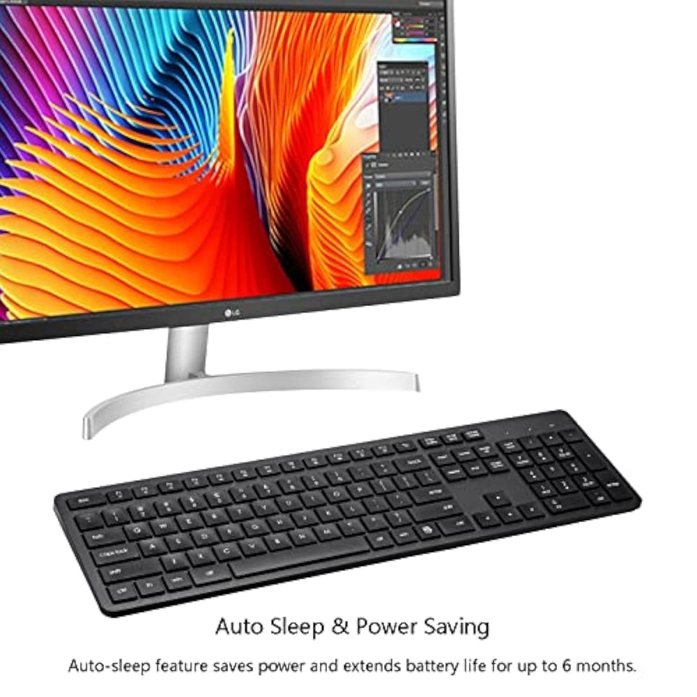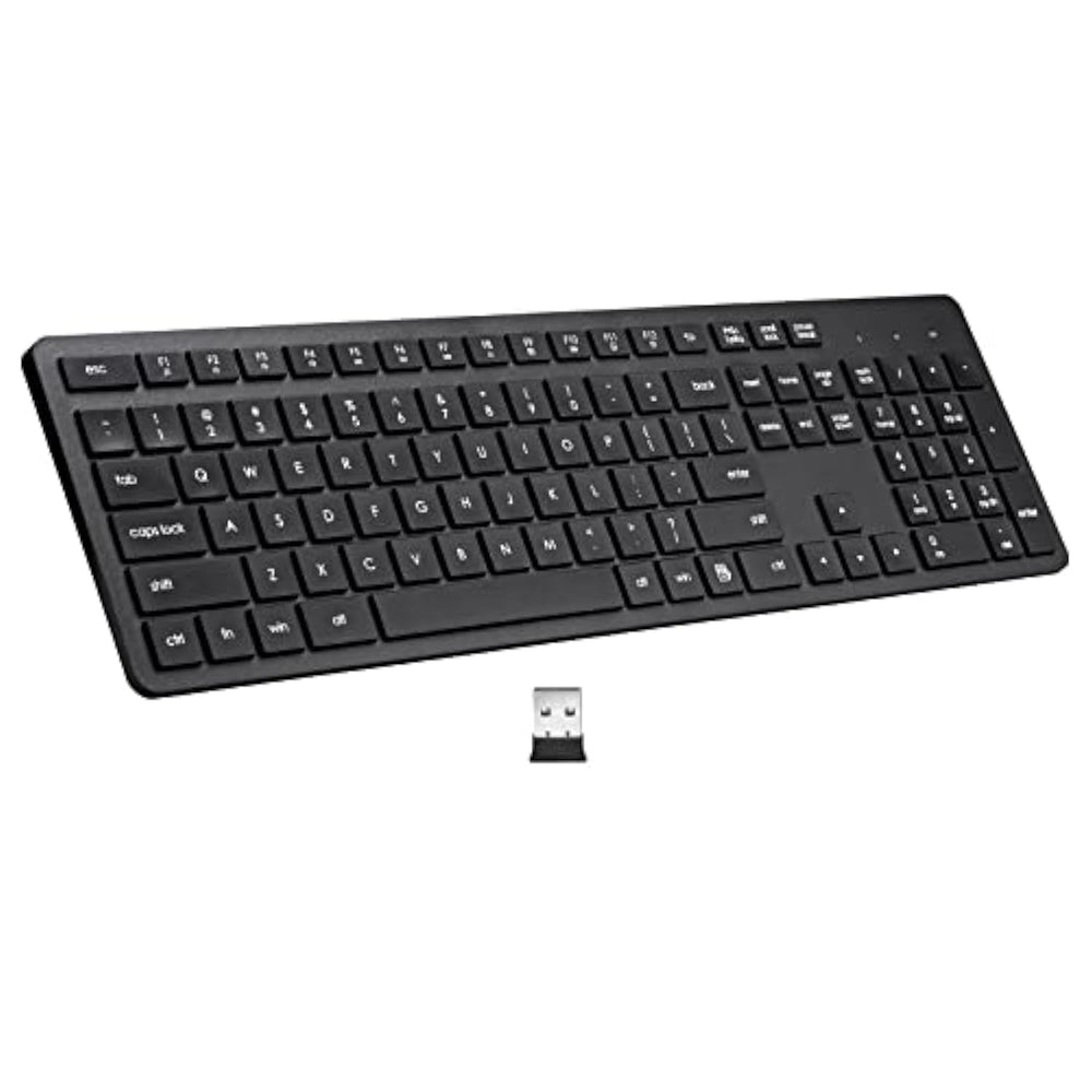 | Full Sized Keyboard: The Us Qwerty Keyboard Features A Tilt Angle For The Great Typing Position, Which Provides You With A Comfortable And Accurate Typing Experience, Prevents Wrist Fatigue. Quiet Clicks Allow You To Focus On Your Work Or Play Without Disturbing Others | | Stable 2.4G Wireless Connection: Plug And Play Without Any Drivers. Advanced 2.4Ghz Wireless Technology Provides A Powerful And Reliable Connection Up To 33 Ft With Virtually No Delays Or Dropouts, Even In The Busiest Wireless Environments. Note: The Usb Dongle Is Stored In The Compartment Next To The Keyboard Battery Slot, And Can Be Found By Opening The Keyboard Battery Cover | | Auto Sleep Power Saving: The Keyboard Features Automatic Sleep Function, When You Stop Using It For More Than 15 Minutes, It Will Go Into Sleep Mode To Save Power And You Can Click Any Button To Activate It, The Battery Life Up To 6 Months. The External Keyboard Is Powered By 1 Aaa Battery (Batteries Not Included) | | Wide Compatibility: Easy To Use, Simply Plug The Usb Receiver Into The Usb Port And Start Working. This Wireless Keyboard Compatible With Windows 11, 10, 8, 7, Vista, Xp, Chrome Os, Linux And Mac Os. Works Well With Desktop, Computer, Pc, Laptop, Chromebook, Notebook And More. Perfect For Office Home Work, Business Travel. Enjoy Your Wireless Freedom And Keep Your Desk Clean And Tidy | | Multimedia Shortcuts: The Full-Sized Cordless Keyboard With Numeric Keypad Features 12 Multimedia Hotkeys For Instant Access To Your Media Player, E-Mail, Internet, Volume, Play/Pause, Mute, Computer And Favorites, So You Can Easily Check Out Your Favorite Sites. Ideal For Office Work And Entertainment, It Saves You Time And Makes Work And Life Easier. Note: The 12 Shortcuts Are Not Fully Compatible With The Mac System | |