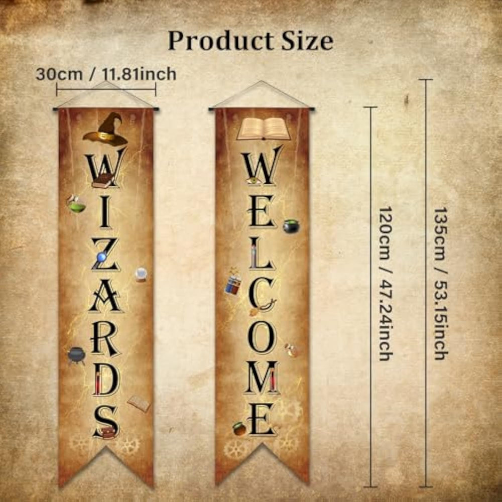 | Wizard Banner Decoration Set: Wizard Banners Are Measured About 47.2 X 11.8 Inches, With Large Letters And Vivid Colors, Easily Stands Out To Catch Everyone'S Eye, They Also Fit For Magical Wizard Party Decorations As A Welcoming Front Door Sign Or Party Decoration | | Reliable Material: Wizards Porch Sign Banners Are Made Of Pongee With Vibrant Printing; With Secure Ropes, They Won'T Get Blown And Twisted With The Slightest Breeze, They Are Nice For Magical Party Decorations | | Wizard Themed Patterns: There Are Many Patterns About Magical That Are Printed On The Wizards Porch Sign, Such As Magical Hats, Books, Etc, They Are Good For Decorating Doorways Halls, Porches, Exterior Party, Fireplace | | Easy To Install: We Have Poles And Ropes On Magic Wizard Themed Photo Props, You Can Hang Them Up Easily, There Are 2 Grommet Holes At The Bottom To Keep The Banner Straight And Prevent It From Flying In The Wind; You Just Need To Hang The Porch Sign On Doors, Windows, Ceilings, Easy To Make A Nice Decoration | | Multipurpose Decoration: Put The Wizards Hanging Banner On The Place Of Wall, Front Door, Stand, Fence, Tree, Wall, Garage Door And Wherever You Want To Decorate, Ideal Photo Booth Backdrop, Wall Decor, Party Supplies, Let You Experience The Magical World, Start To Take Risks Again, And Keep Magic Alive Every Day | |