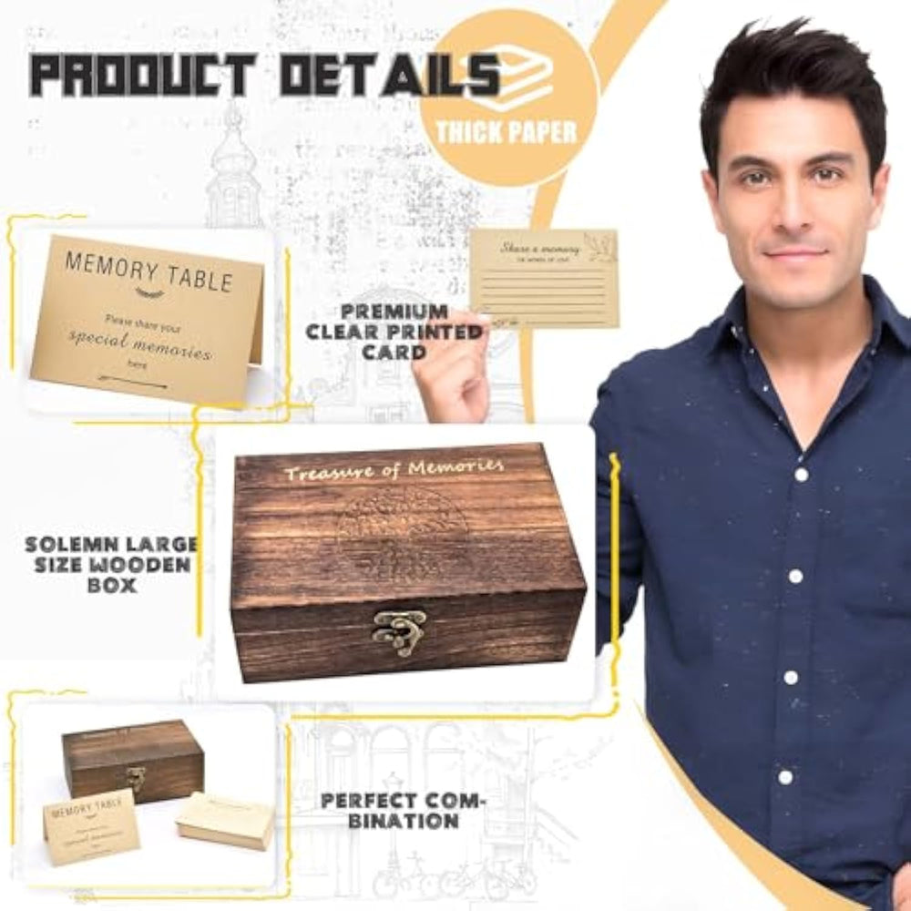 | [ Premium Materials ] --- The Memory Box Is Made Of High-Quality Wood, Which Is Healthy, Non-Toxic And Durable. The Cards Are Made Of Premium Kraft Card Paper, Which Is Hard Smooth And Easy For Writing. | | [ Set Includes ] --- 50 Pcs Share A Memory Cards (4.9 X 3.3 In) ,1 Pcs Guidance Card (6.6 X 4.9 In) And 1 Pcs Wooden Memory Box (7.1 X 4.3 X 2.7 In). Compared With Similar Products, We Provide Larger Size Cards And Wooden Boxes To Facilitate Writingreading And To Store More Memory Carriers Or Other Things. | | [ Creative And Meaningful Design ] --- Premium Solid Wood Boxfeatures An Intricately Carved Tree Of Life On The Lid, Symbolizing Eternal Love And Cherished Memories. Write Condolences, Wedding Vows, Birthday Wishes, Or Graduation Notes – Perfect For Sharing Memeories, Love, Gratitude, Or Comfort During Life’S Milestones. | | [ Multi-Occasion Application ] --- Versatile For Life’S Most Meaningful Moments. Designed As A Funeral Memory Box (Urn Companion), Wedding Vow Capsule, Birthday Gratitude Journal, Or Graduation Keepsake. Compact Size Fits Photos, Jewelry, Or Small Trinkets, Also Making It A Timeless Heirloom. A Perfect Decoration At Events And Gatherings, Perfect For Placement In A Memory Jar, Memory Book Or Guest Book Alternative. | | [ Hassle-Free Service ] --- If You Encounter Any Quality Issues Or Dysfunction With The Product, Please Do Not Hesitate To