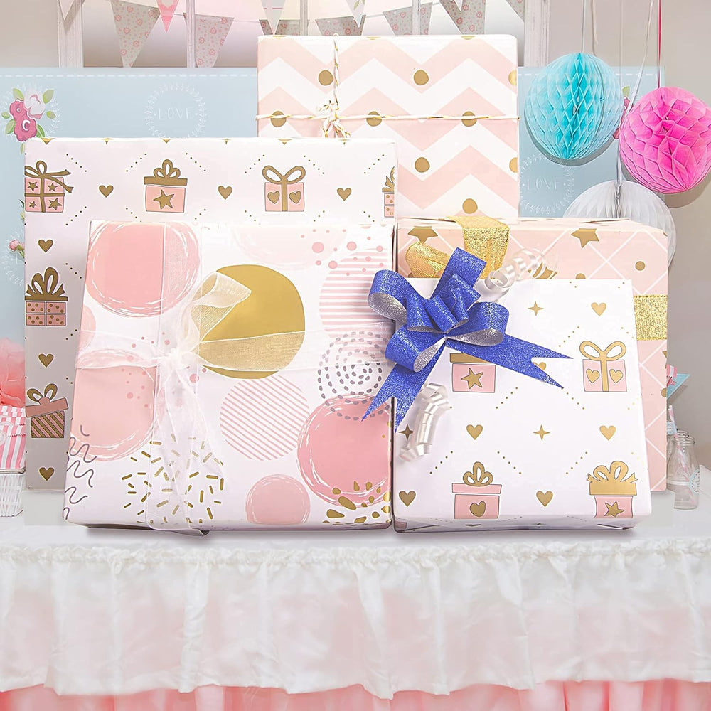 | Value Pack: Total 4 Sheets Of Cute Designs. All In One Size 27.5 X 19.6 Inches (70 X 50 Cm), They Are Large Enough To Meet Your Wrap Needs, And It Can Be Cut Freely, Very Easy To Fold Unique Design: Gift Wrapping Paper Has A Dreamy Pink Theme With Four Lovely Patterns, Pink Small Gift Box, Wave, Plaid, And Big Polka Dot. Especially Using The Unique Pink Printed Gold Design, Add Some Shinny Dots, Good Looking And High Class Romantic And Sparkly: Birthday Wrapping Paper Has A Faint Bling Bling Of Gold On Its Surface. Wrapping Your Gift With It Will Make Your Gift More Eye-Catching And Special Than Others' Gifts. Also, The Romantic Pink Color Is The Best Choice For Your Lover Premium Quality: Made Of High Quality Paper Material, Bright Colors, Clear Printing, Thick And Not Easy To Tear Or Rip, Good Value For Money, Perfect For Wrapping Birthday Gifts For Girls And Cute Boys Use All Occasion: The Beautiful Valentines Wrapping Paper, Perfect For Birthday, Valentine'S Day, Christmas, Wedding, Baby Shower, Congrats. Also Great For Craft Projects, Table Coverings, Diy Origami Artwork And More