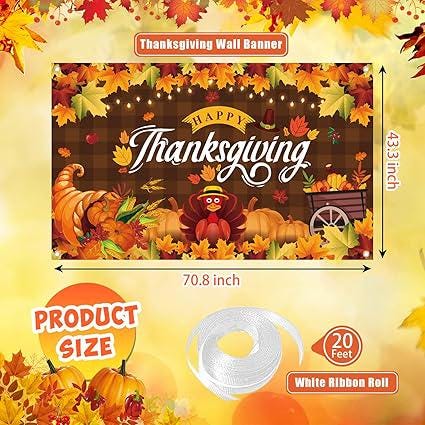This 72x44 inch Thanksgiving banner features vibrant fall elements like pumpkins, maple leaves, and turkeys, creating a festive and eye-catching backdrop for parties and photos. Made of durable, high-quality polyester, it is soft, long-lasting, and suitable for both indoor and outdoor use. Ideal for Thanksgiving party decorations, photo studios, wall decor, table displays, yard or front door accents, and photo booths. The banner includes four corner grommets and 20 feet of rope for easy hanging or horizontal display.