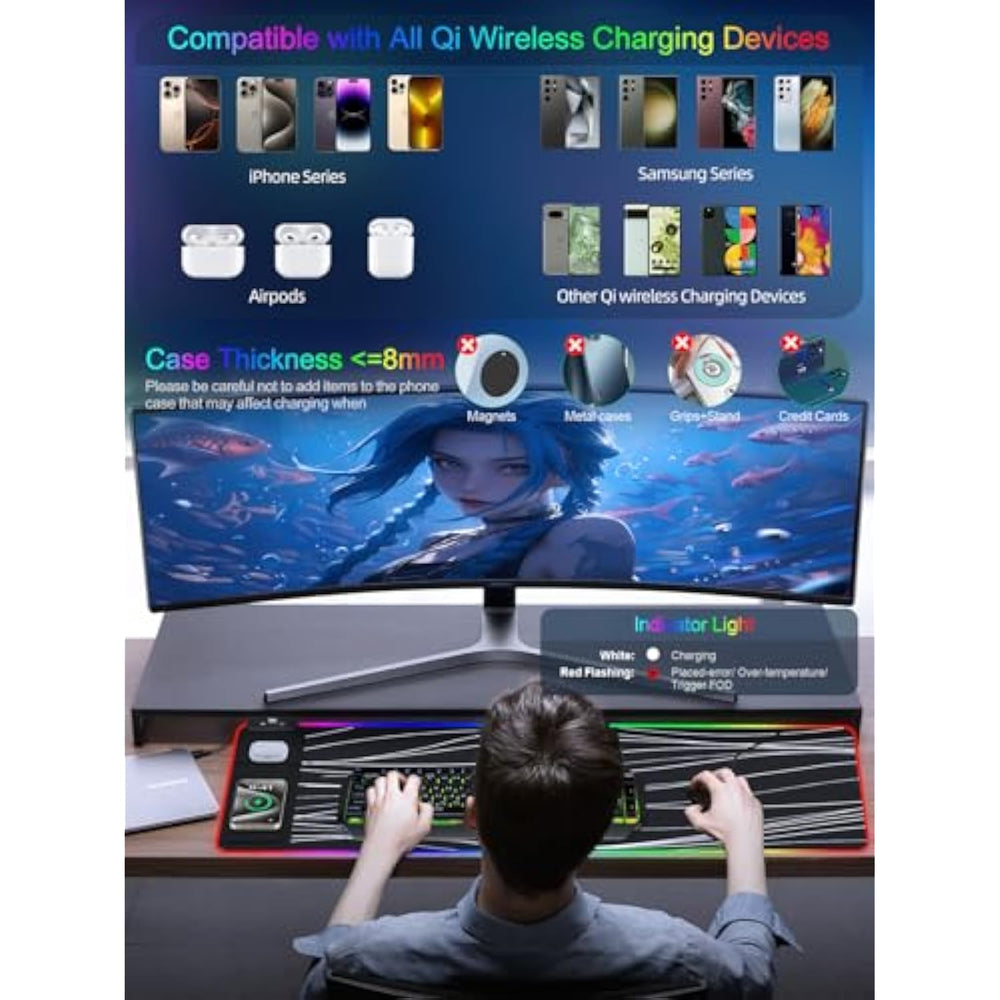 | ?Fast Charging Mouse Pad With Phone Holder?Gaming Mouse Pad Has Built-In 15W Fast Wireless Charging Function, Which Can Conveniently Charge Your Compatible Devices Without Extra Cables Interfering With Your Desktop. Desk Mat Compatible With Iphone 15/14/13/12/11/X/Xr/Xs/8 Series; Samsung Galaxy S23/S22/S21/S20/S10/S9/S8/Note 9/8; Airpods 3Rd/Airpods Pro 2Nd/Airpods Pro And Other Qi Enabled Devices. (Note: 15W Need Power Adapter 9V 3A, And Power Adapter Is Not Included With This Mousepad) | | ?Desk Mat With 11 Rgb Lighting Modes?Led Mouse Pad Designed With 11 Different Lighting Modes - 2 Dynamic Modes And 11 Static Lighting Modes; Rgb Gaming Mouse Pad Allows You To Personalize Your Gaming Setup. Choose Your Favorite Color To Create A Visually Stunning Gaming Experience. The Power-Off Memory Function Can Remember Your Last Light Mode Choice. Awesome Cool Gaming Mousepad. | | ?Xxl Oversized Desk Pad?Mouse Pad Has Large Size 31.49X15.75 Inch, The Extended Mousepad Provides A Larger Usable Area To Cover Your Keyboard, Mouse And Other Stuffs On Your Desktop. Desk Pad Provides A Comfortable Experience While Playing Games Or Working. And Protect Your Desktop From Scratches, Stains And Water Spills. Say Goodbye To Messy Desktop And Hello To A Clean And Organized Workspace. | | ?4Mm Thick High-Quality Mousepad?The Mouse Pad Features A Nano-Textured Fabric Surface And Stitched Edges To Ensure Durability. The Ultra-Smooth Surface Provides More Precise Mouse Movement. Less Resistance Compared To Other Mouse Pads. Waterproof Surface Is Easy To Clean And Non-Slip Rubber Base Can Firmly Grip Your Desktop, Taking Your Gaming Experience To The Higher Level. | | ?Easy To Use?Extended Mouse Pad Is Powered By Usb And No Driver Required. One Button Controls All Light Modes, Press Once To Switch Light Color, Long Press To Switch Light Modes. The Wireless Charging Function And Rgb Lighting Can Work Separately. Just Plug And Play. Awesome Gaming Mouse Pad For Gamer Esports Pros. | |