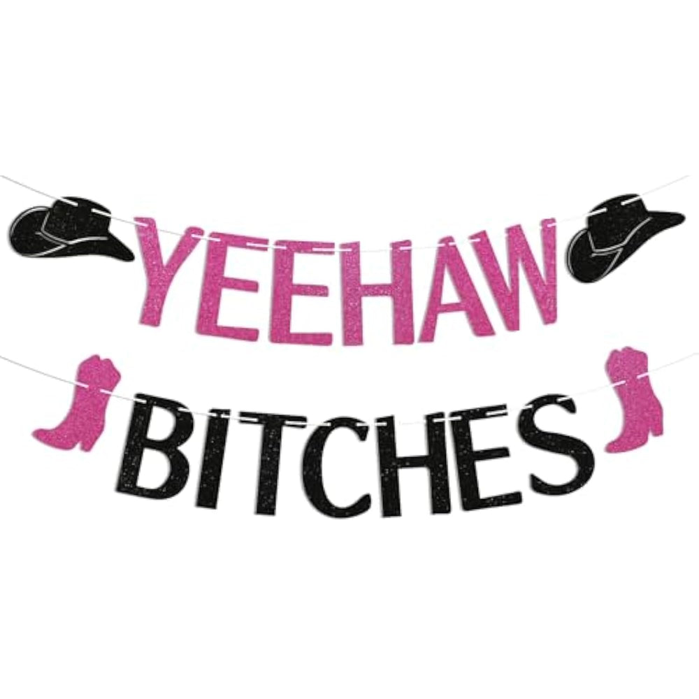 | Yeehaw B*Tches Banner: Nashville Bachelorette Party Decorations | | Made With Premium Cardstock: Gold Glitter Hot Pink Black Design | | Varying Letter Sizes: Ranging From 4-6 Inches Tall | | Diy Assembly Required: Pre-Cut Letters And String Included | | Perfect For Nashville Themed Bachelorette Party | |