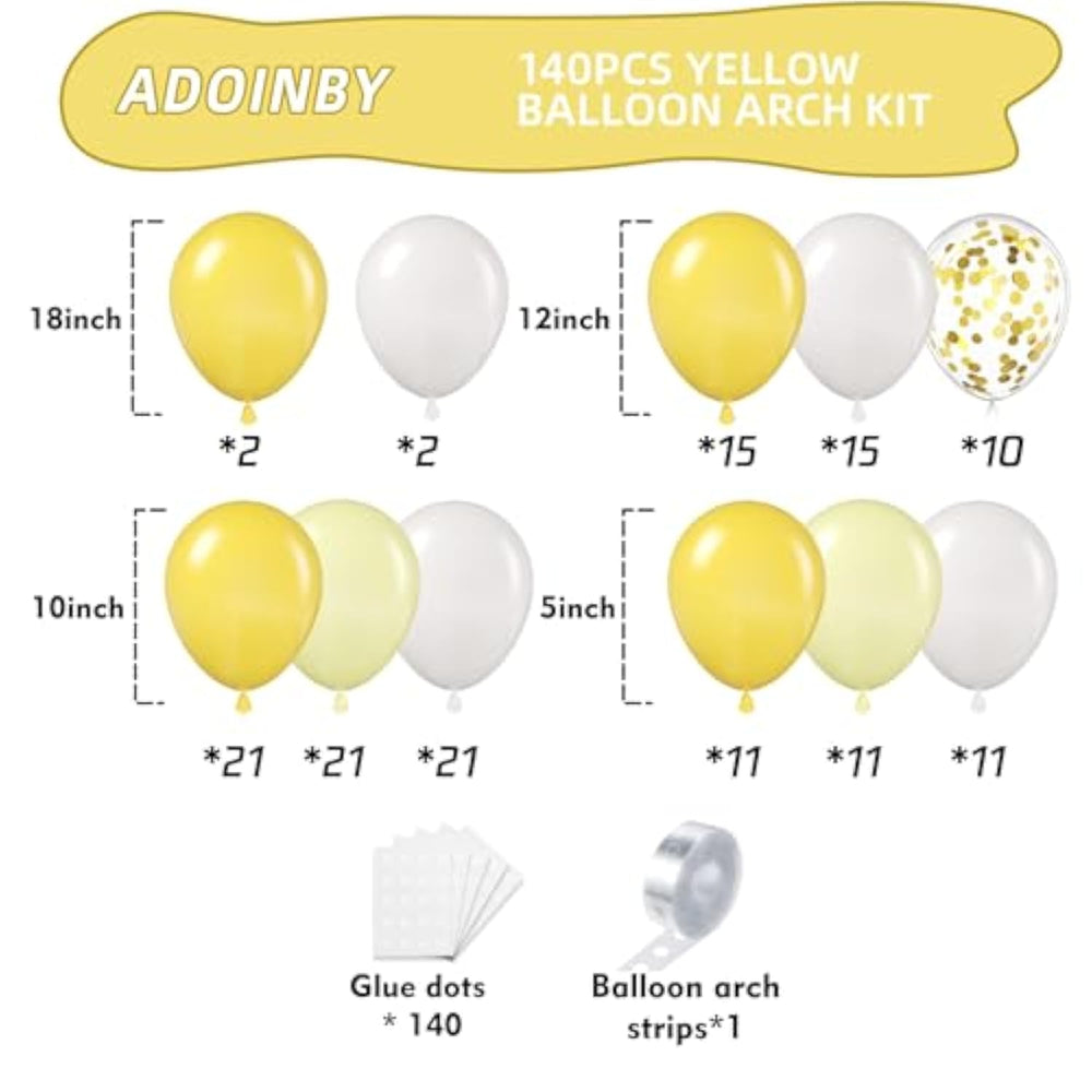 This Yellow Balloon Garland Arch Kit includes 140 pastel yellow, white, and gold confetti balloons in a variety of sizes, along with a 16FT balloon strip and 140 glue dots for easy setup. Made from high-quality, non-toxic latex, the balloons can be filled with air or helium and are designed to be durable. Assembly is simple with the included tools—just insert balloon knots into the strip and secure with glue dots. Perfect for weddings, birthdays, baby showers, and themed parties, this vibrant kit adds a cheerful touch to any celebration.