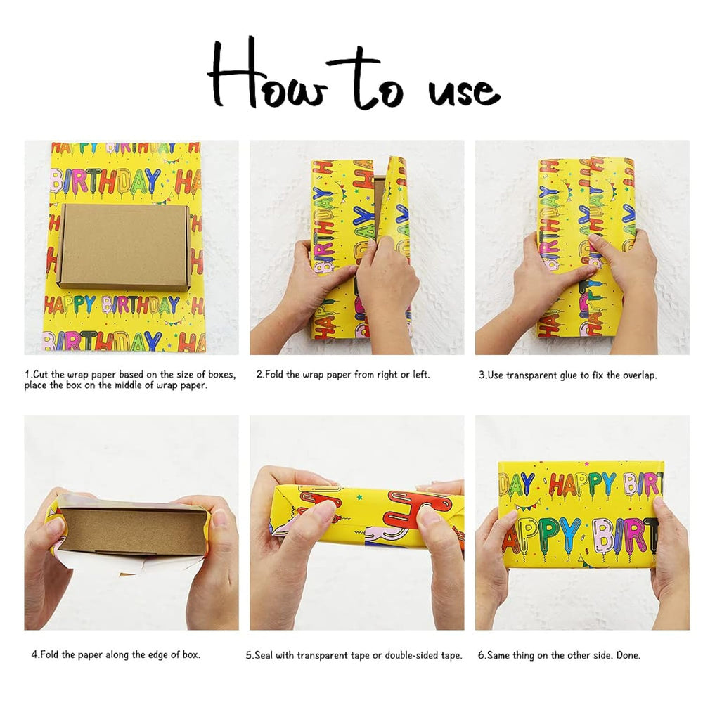 | ???Great Value Pack?: Package Includes 6 Sheets Happy Birthday Letter Pattern Wrapping Papar. Enought To Meet Your Various Birthday Gift Wrapping Needs. ?? ?Special Birthday Design?: This Wrapping Paper Set Comes With One Beautiful Design-"Happy Birthday" Letters In Mixed Color On Yellow Wrapping Art Paper, Which Definitely Brings You A Strong Visual Impact And Impressed You. ?? ?Perfect Size?: Includes 6 Large Sheets 20 X 28 Inches Per Sheet, Perfectly Fit For Packages In Different Size From Small, Medium To Large. Flat Wrapping Paper Sheets Are Folded For Easy Storage, Take Up Less Storage Space Than Traditional Rolls Of Gift Wrap. ?? ?Premium Quality?: Created With High-Quality Art Paper Materials, Thick Enough That It Doesn'T Rip On Corners But Not Too Thick That It Is Hard To Work With. ?? ?Widely Used?: Suitable For Different Ages And Occasions Like Birthday Parties, Kids Crafts, Diy Decorations, Congrats, Wedding, Holidays, Home Decoration And More. Sure To Make Your Gifts Stand Out At The Birthday Party.