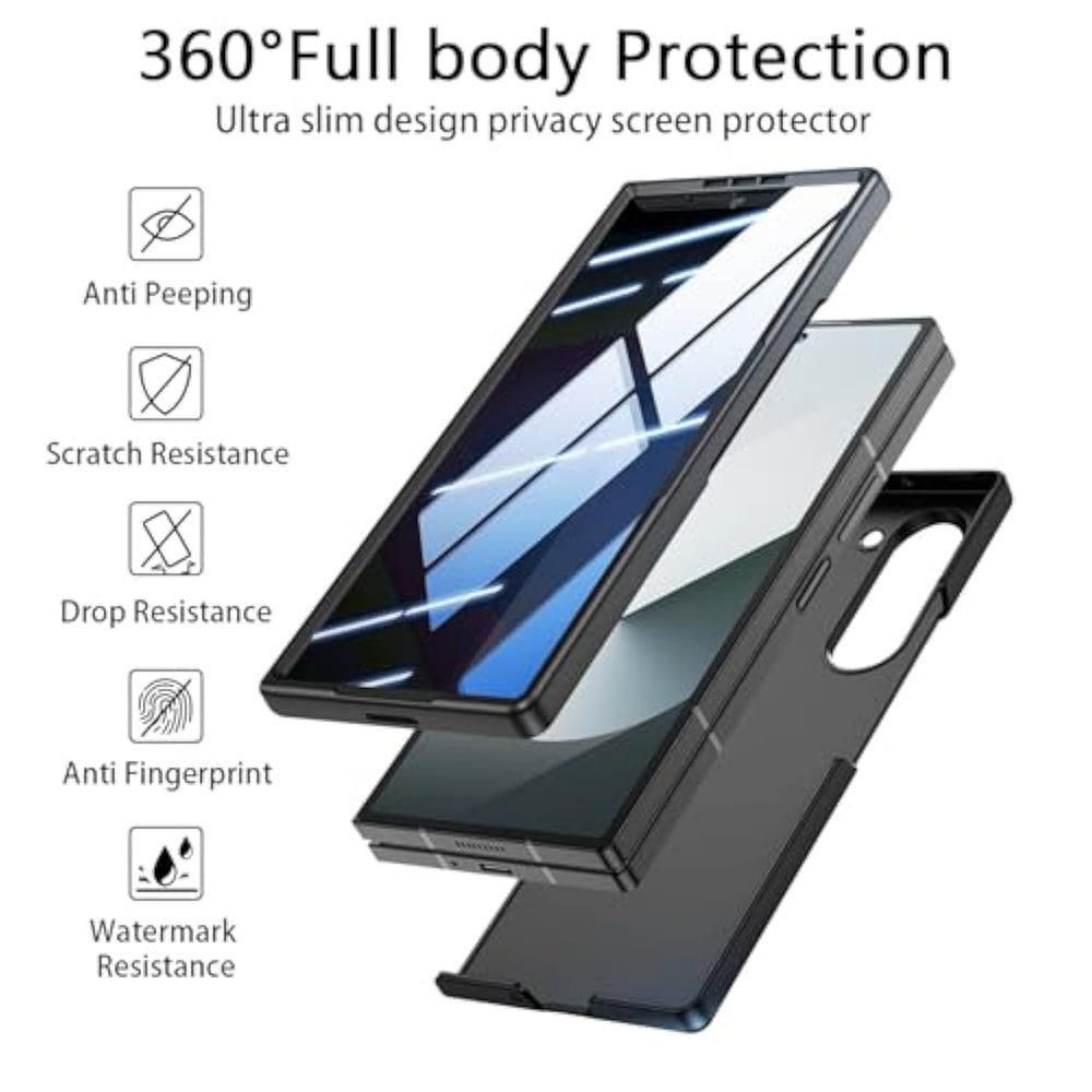 | Compatible With Samsung Galaxy Z Fold 5 Case: Galaxy Z Fold 5 Privacy Case Special Designed For Your Samsung Z Fold 5 5G. Supports Wireless Charging. | | Built-In Privacy Screen Protector: The Samsung Galaxy Z Fold 5 Case Cover With A 30-Degree Antipeeping Screen Protector, Keeps Your Private Moments And Sensitive Details From The Curious Eyes Of Strangers, Especially On The Bus, Elevator, Metro, Or Other Public Occasions. | | Anti-Scratch Anti-Yellowing:This Galaxy Z Fold5 Case Is Made Of High-Grade Germany Pc With A Special Coating, Has A Matte Effect, And Has Super Anti-Fingerprint, Anti-Scratch And Anti-Stain Performance. | | Camera And Screen Protection :The Galaxy Fold 5 Cases Built-In With Privacy Screen Protector. This Case Not Only Protects The Camera, But Also Protects Your Phone Screen. | | Slim-Fit Profile: Our Samsung Z Fold 5 5G Slim Case Design For Keep Original Beauty Of Your Phone, Easy To Daily Grip And Carry. | | Perfect Details Design: Privacy Phone Case For Samsung Galaxy Z Fold 5 Fits Perfectly, The Cut Is Precise, Open Cutouts Provide Full Access To The Cover Screen, Camera, Buttons And Charging Port Etc.Let You Use Your Galaxy Fold Z 5 Without Worries | |