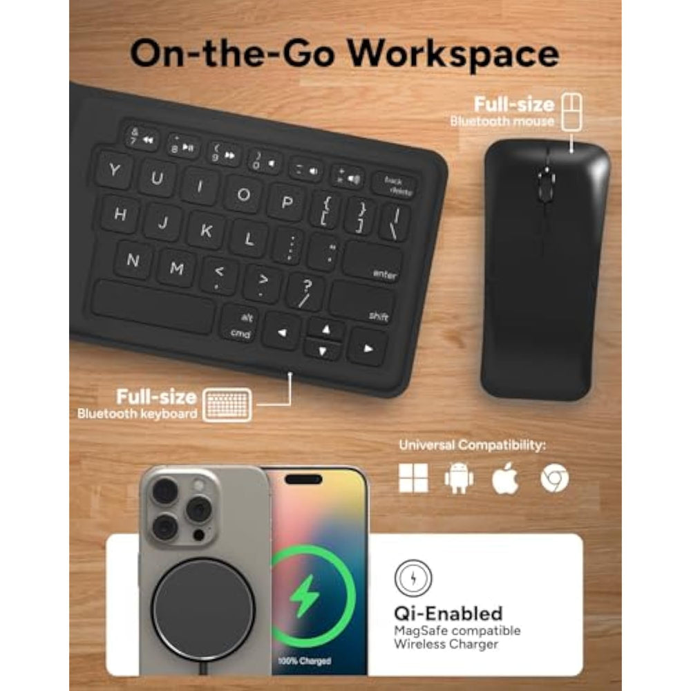 | COMPLETE DESKTOP SETUP ON-THE-GO: Includes a Bluetooth foldable keyboard and mouse for seamless productivity wherever you travel | | WIRELESS MULTIPLE CHARGING OPTIONS: Qi-enabled wireless charger with MagSafe compatibility, USB-C to USB-C cable, 20W wall adapter, and 15W car charger for versatile power solutions | | CONNECT TO MONITORS: Use the USB-C to HDMI adapter to display your content on a larger screen, enhancing your mobile device's capabilities | | INTERNATIONAL POWER ADAPTERS: Stay powered worldwide with adapters for the US, UK, Europe, and Australia, ensuring your devices are always ready to use | | COMPACT ORGANIZED TRAVEL CASE: Durable, zippered case with dedicated pouches for all components, including a tablet/phone stand with six adjustable angles, making it easy to grab and go | |